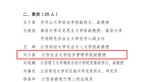近日,江西省老龄工作委员会办公室印发了江西省老龄工作委员会第一届专家委员会委员名单,研究院\中心刘小春副教授荣列其中。刘小春副教授长期关注农村居民养老问题,主持完成的国家社科基金项目与教育部人文社会科学研究项目紧紧围绕农民居民养老服务选择与供给进行研究,在农村居民养老服务领域形成了深厚的学术积累。此次入选江西省老龄工作委员会第一届专家委员会委员,是对其长期深耕农民居民养老领域研究的高度认可,也体现我院社会服务能力进一步增强。此外,刘小春副教授还于2024年获聘江西省十四届人大社会建设委员会专家顾问,凸显其在社会建设领域的影响力。
